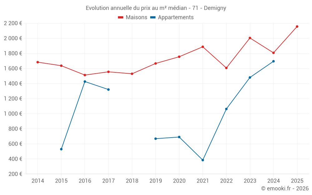 Le prix médian sur les 27 transactions de maisons des 24 derniers mois dans la commune de Demigny était de 1 970 € par mètre carré pour une valeur foncière médiane de 215 200 €. Sur cette période 60% des transactions se sont situées entre 1 455 et 2 575 € par mètre carré (du 2ème au 8ème déciles).