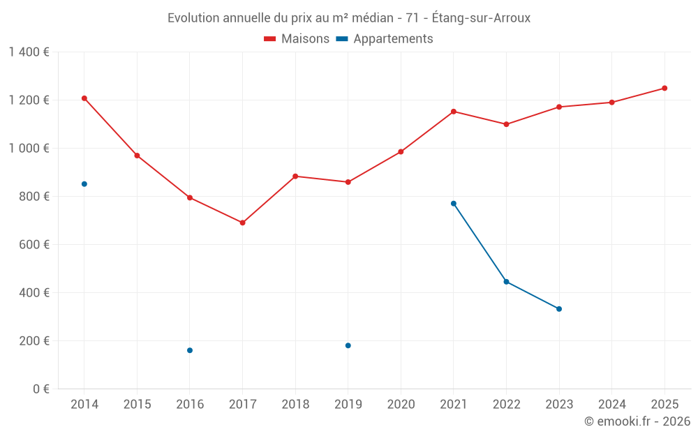 Le prix médian sur les 21 transactions de maisons des 12 derniers mois dans la commune d'Étang-sur-Arroux était de 1 250 € par mètre carré pour une valeur foncière médiane de 126 000 €. Sur cette période 60% des transactions se sont situées entre 743 et 1 826 € par mètre carré (du 2ème au 8ème déciles).