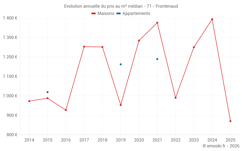 Le prix médian sur les 22 transactions de maisons des 24 derniers mois dans la commune de Frontenaud était de 1 289 € par mètre carré pour une valeur foncière médiane de 131 532 €. Sur cette période 60% des transactions se sont situées entre 730 et 1 902 € par mètre carré (du 2ème au 8ème déciles).