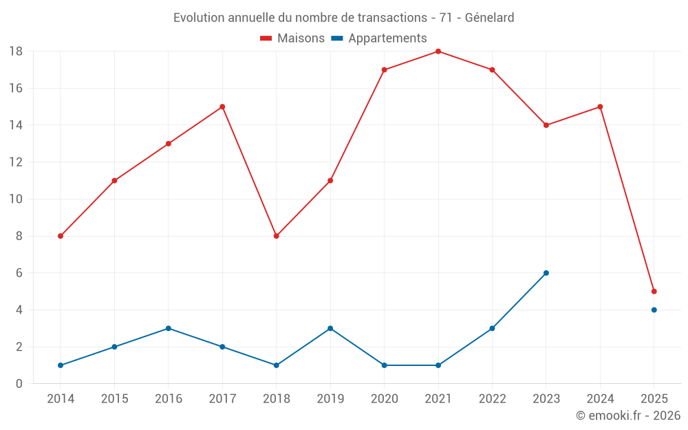 Le prix médian sur les 27 transactions de maisons des 24 derniers mois dans la commune de Génelard était de 779 € par mètre carré pour une valeur foncière médiane de 68 000 €. Sur cette période 60% des transactions se sont situées entre 482 et 1 280 € par mètre carré (du 2ème au 8ème déciles).