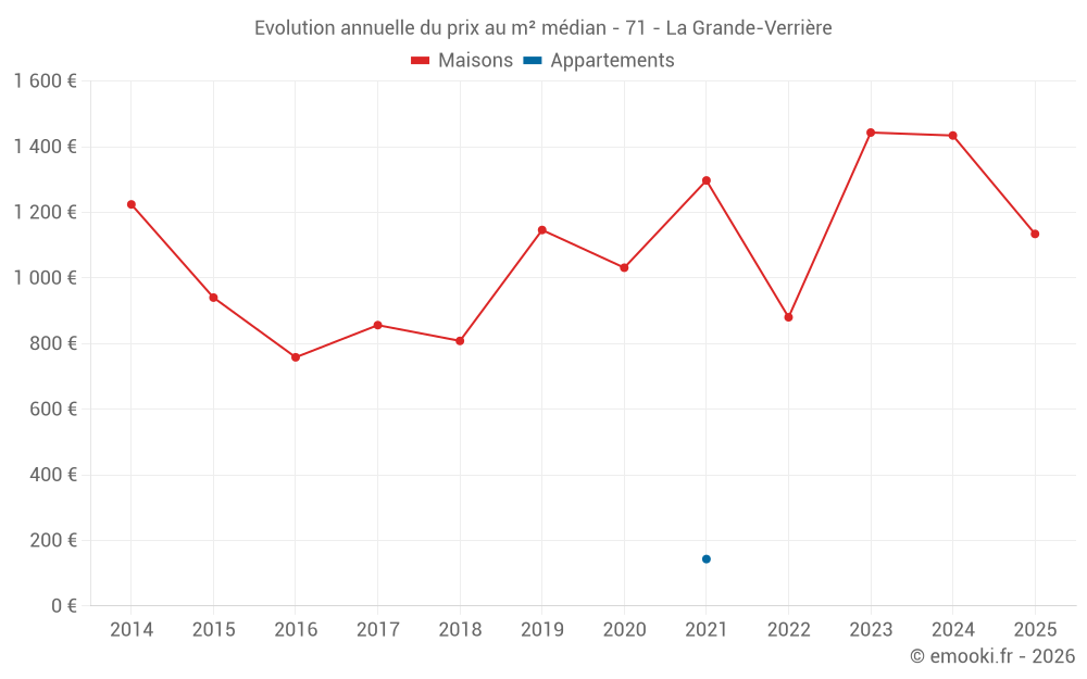 Le prix médian sur les 17 transactions de maisons des 24 derniers mois dans la commune de la Grande-Verrière était de 1 340 € par mètre carré pour une valeur foncière médiane de 99 500 €. Sur cette période 60% des transactions se sont situées entre 866 et 1 939 € par mètre carré (du 2ème au 8ème déciles).
