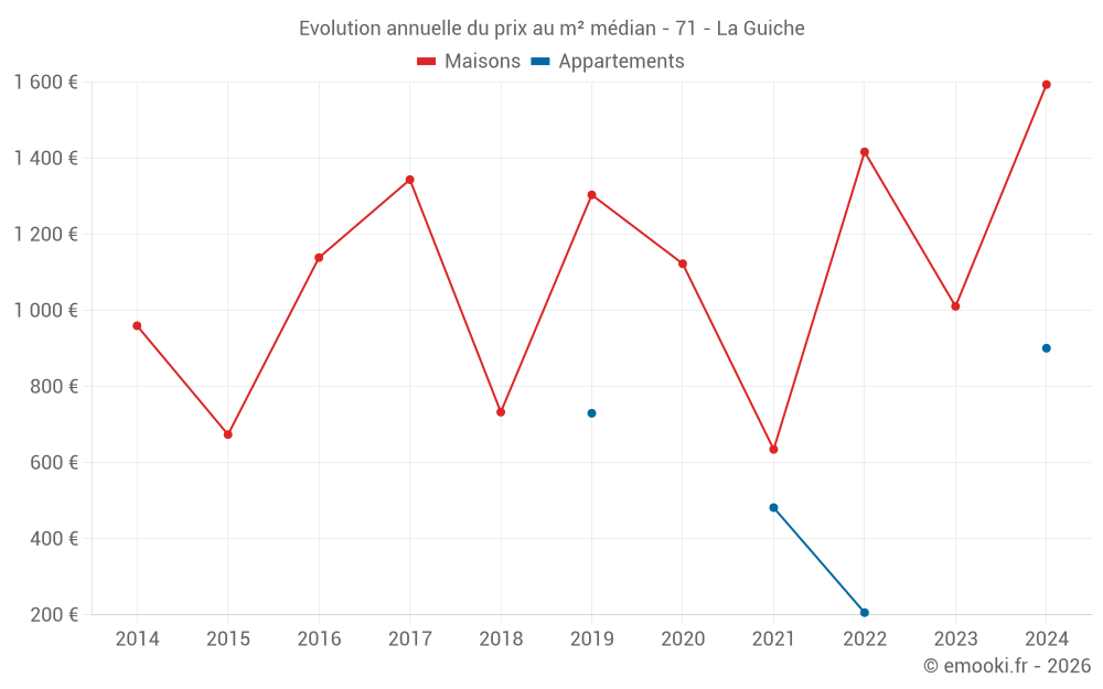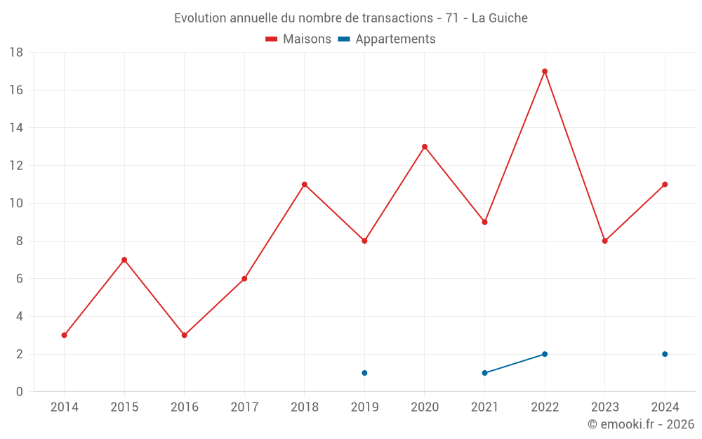 Le prix médian sur les 15 transactions de maisons des 24 derniers mois dans la commune de la Guiche était de 1 374 € par mètre carré pour une valeur foncière médiane de 129 390 €. Sur cette période 60% des transactions se sont situées entre 775 et 2 507 € par mètre carré (du 2ème au 8ème déciles).