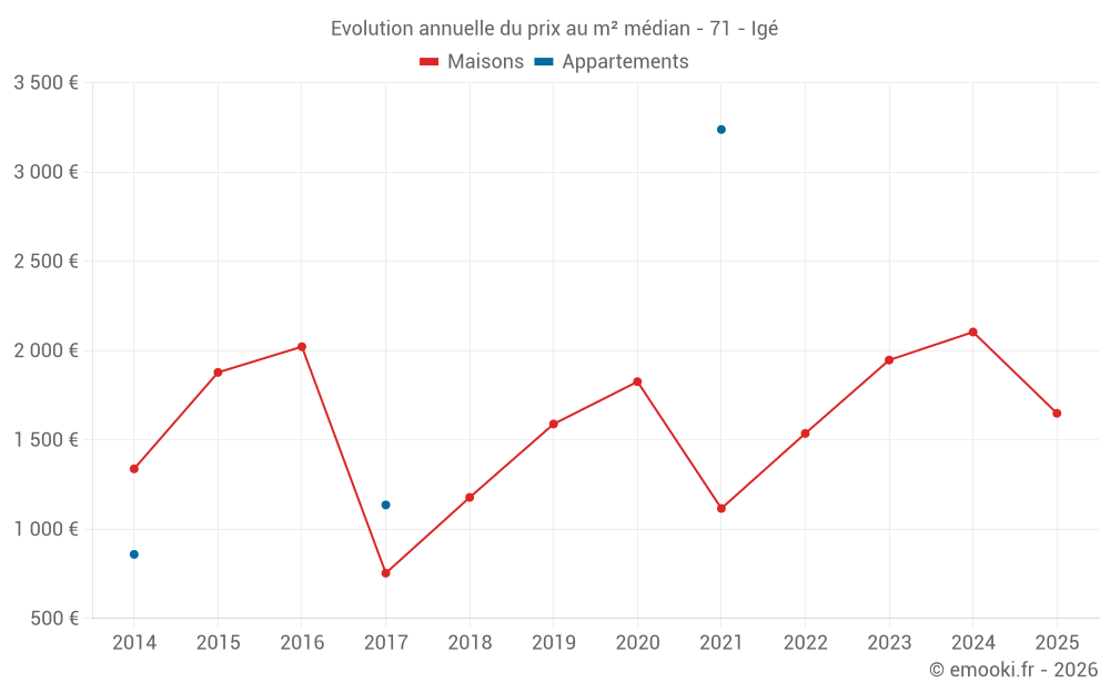 Le prix médian sur les 15 transactions de maisons des 24 derniers mois dans la commune d'Igé était de 1 983 € par mètre carré pour une valeur foncière médiane de 215 450 €. Sur cette période 60% des transactions se sont situées entre 1 549 et 2 623 € par mètre carré (du 2ème au 8ème déciles).