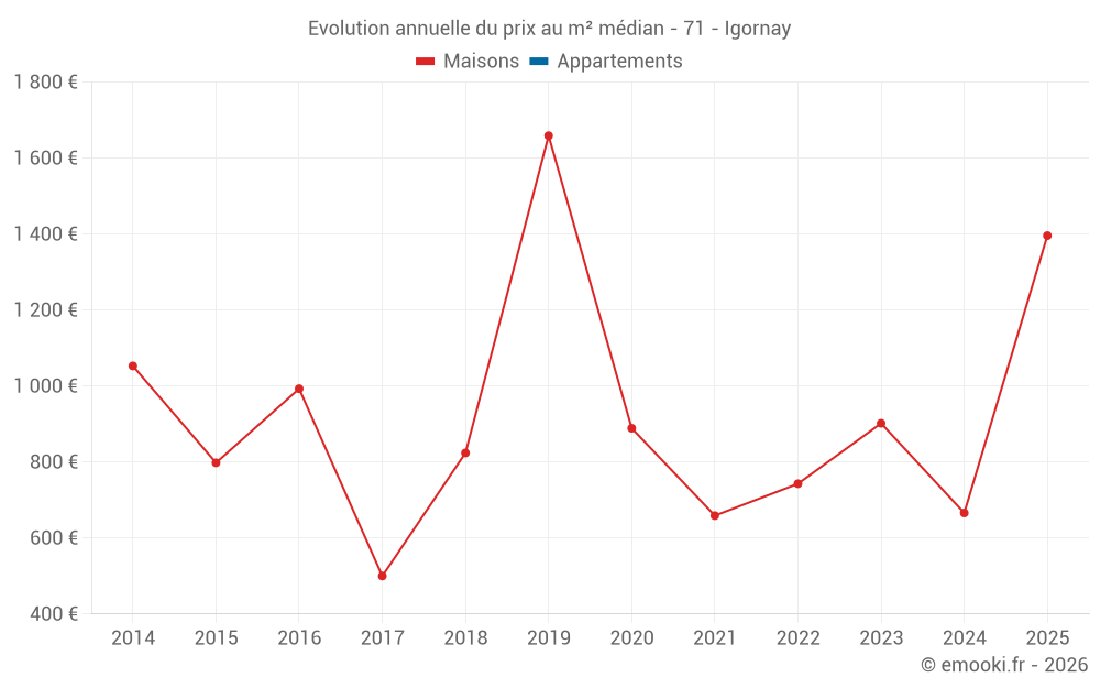 Le prix médian sur les 16 transactions de maisons des 24 derniers mois dans la commune d'Igornay était de 958 € par mètre carré pour une valeur foncière médiane de 70 000 €. Sur cette période 60% des transactions se sont situées entre 652 et 1 729 € par mètre carré (du 2ème au 8ème déciles).