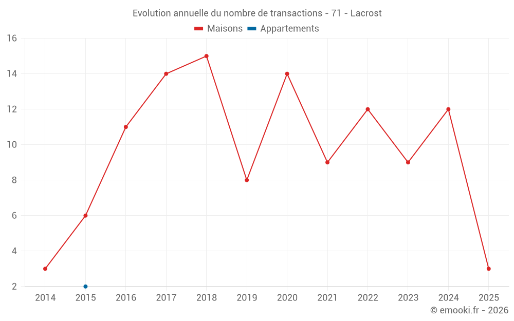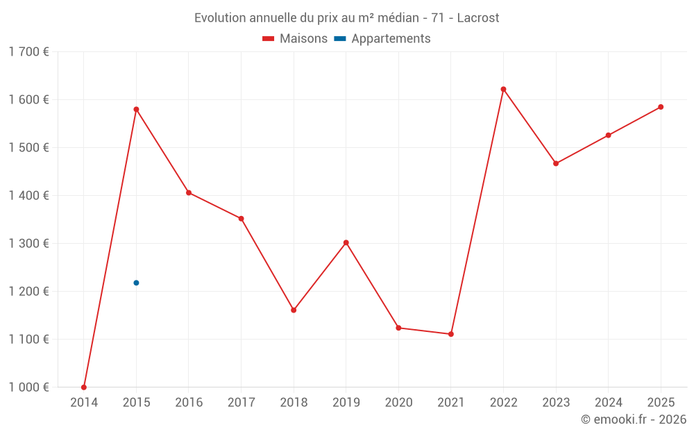 Le prix médian sur les 19 transactions de maisons des 24 derniers mois dans la commune de Lacrost était de 1 583 € par mètre carré pour une valeur foncière médiane de 138 000 €. Sur cette période 60% des transactions se sont situées entre 1 158 et 1 878 € par mètre carré (du 2ème au 8ème déciles).