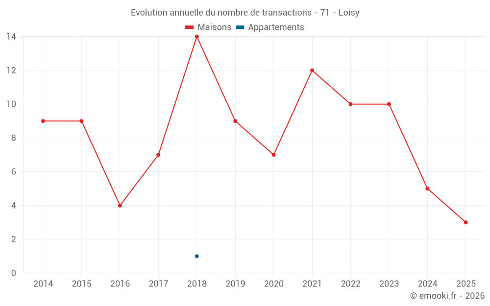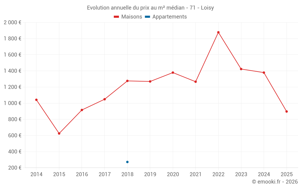 Le prix médian sur les 15 transactions de maisons des 24 derniers mois dans la commune de Loisy était de 1 379 € par mètre carré pour une valeur foncière médiane de 142 000 €. Sur cette période 60% des transactions se sont situées entre 634 et 2 232 € par mètre carré (du 2ème au 8ème déciles).