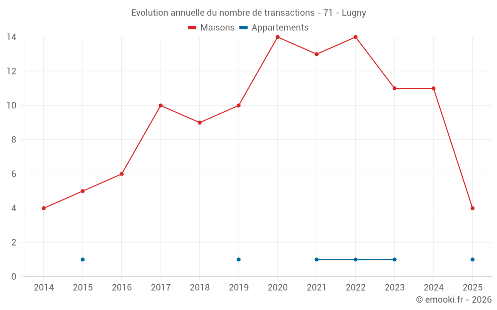 Le prix médian sur les 20 transactions de maisons des 24 derniers mois dans la commune de Lugny était de 1 667 € par mètre carré pour une valeur foncière médiane de 168 500 €. Sur cette période 60% des transactions se sont situées entre 1 060 et 1 794 € par mètre carré (du 2ème au 8ème déciles).
