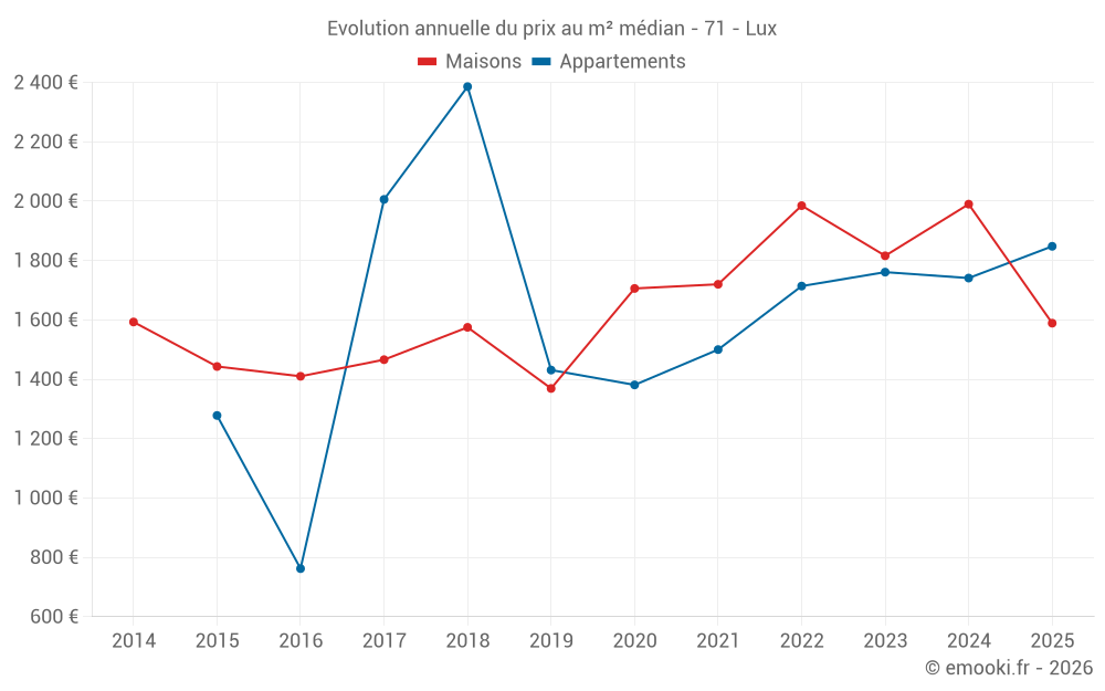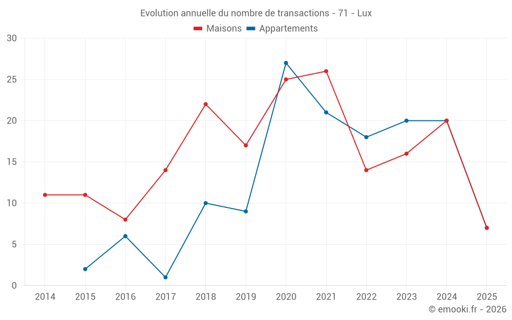 Le prix médian sur les 18 transactions de maisons des 12 derniers mois dans la commune de Lux était de 1 760 € par mètre carré pour une valeur foncière médiane de 180 675 €. Sur cette période 60% des transactions se sont situées entre 1 404 et 2 364 € par mètre carré (du 2ème au 8ème déciles).