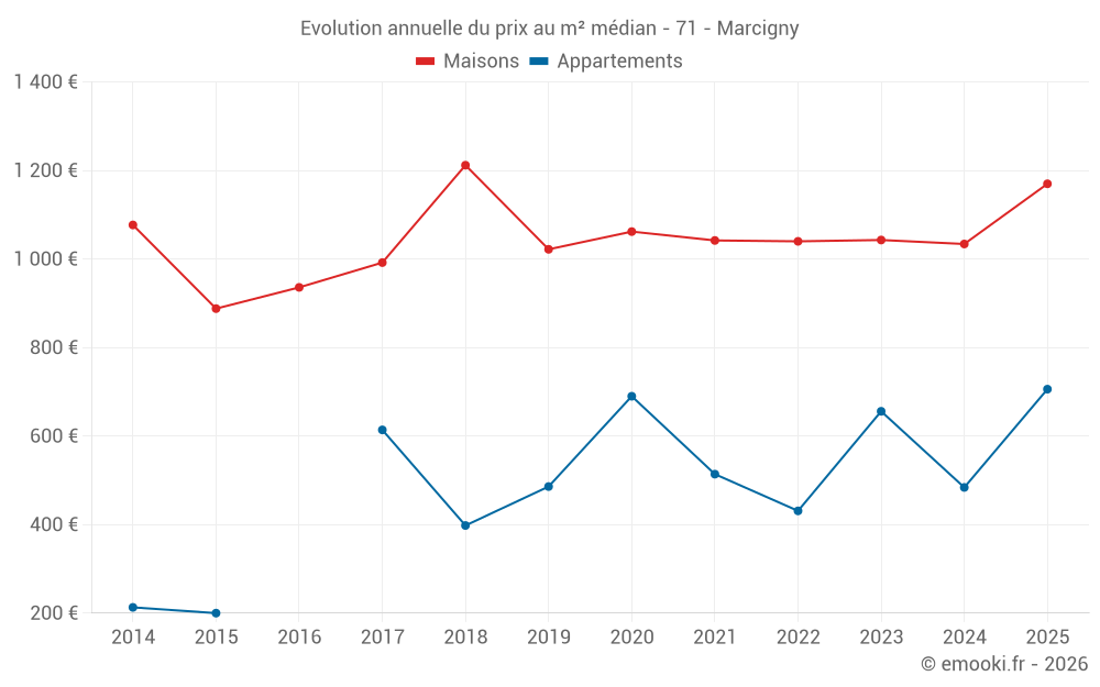 Le prix médian sur les 23 transactions de maisons des 12 derniers mois dans la commune de Marcigny était de 1 174 € par mètre carré pour une valeur foncière médiane de 115 000 €. Sur cette période 60% des transactions se sont situées entre 807 et 1 694 € par mètre carré (du 2ème au 8ème déciles).