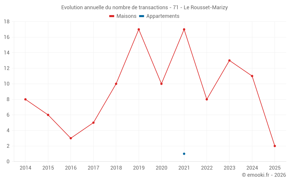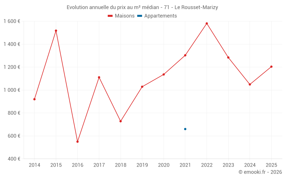 Le prix médian sur les 20 transactions de maisons des 24 derniers mois dans la commune du Rousset-Marizy était de 1 159 € par mètre carré pour une valeur foncière médiane de 151 750 €. Sur cette période 60% des transactions se sont situées entre 679 et 2 238 € par mètre carré (du 2ème au 8ème déciles).