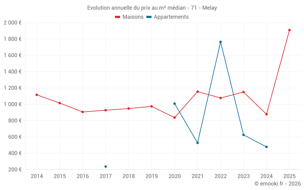 Le prix médian sur les 30 transactions de maisons des 24 derniers mois dans la commune de Melay était de 1 142 € par mètre carré pour une valeur foncière médiane de 101 525 €. Sur cette période 60% des transactions se sont situées entre 499 et 1 790 € par mètre carré (du 2ème au 8ème déciles).
