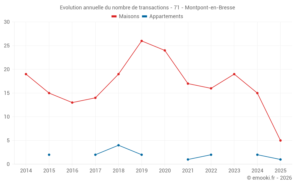 Le prix médian sur les 32 transactions de maisons des 24 derniers mois dans la commune de Montpont-en-Bresse était de 1 378 € par mètre carré pour une valeur foncière médiane de 130 700 €. Sur cette période 60% des transactions se sont situées entre 1 044 et 1 842 € par mètre carré (du 2ème au 8ème déciles).