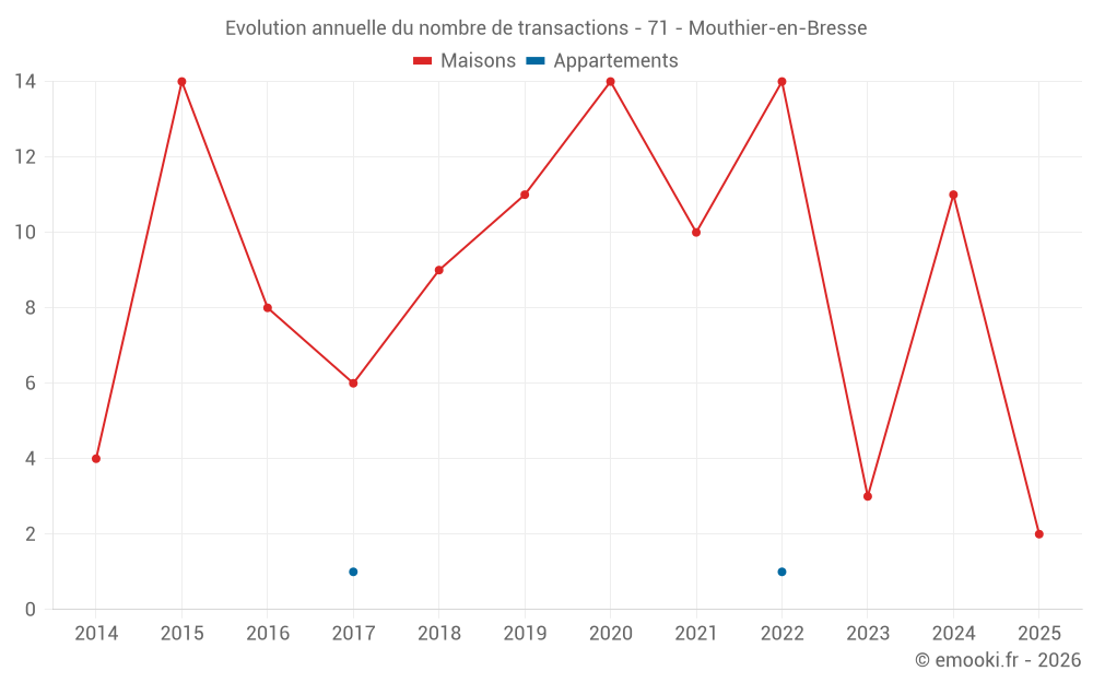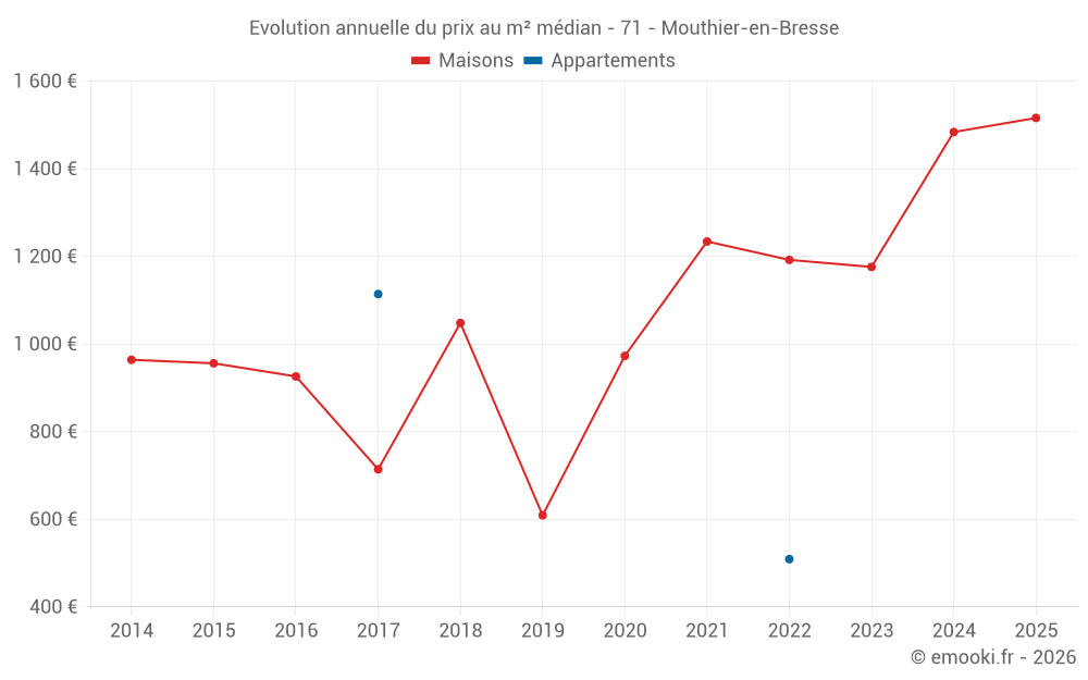 Le prix médian sur les 15 transactions de maisons des 24 derniers mois dans la commune de Mouthier-en-Bresse était de 1 484 € par mètre carré pour une valeur foncière médiane de 159 000 €. Sur cette période 60% des transactions se sont situées entre 993 et 1 818 € par mètre carré (du 2ème au 8ème déciles).