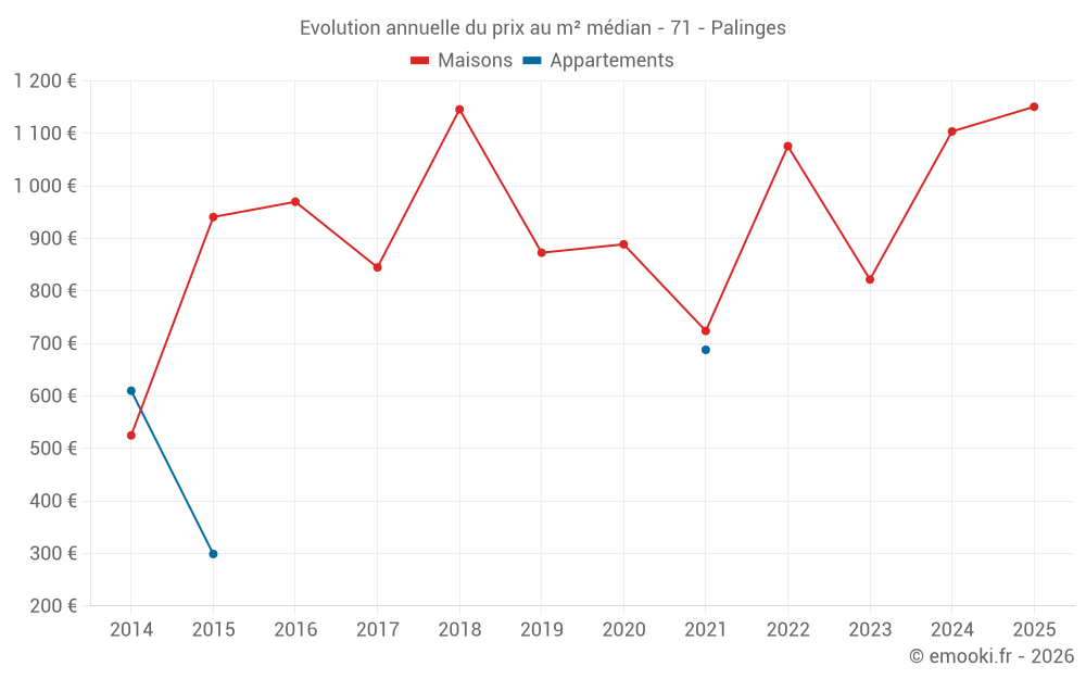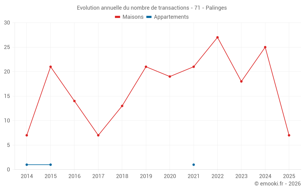 Le prix médian sur les 42 transactions de maisons des 24 derniers mois dans la commune de Palinges était de 1 078 € par mètre carré pour une valeur foncière médiane de 100 000 €. Sur cette période 60% des transactions se sont situées entre 725 et 1 490 € par mètre carré (du 2ème au 8ème déciles).