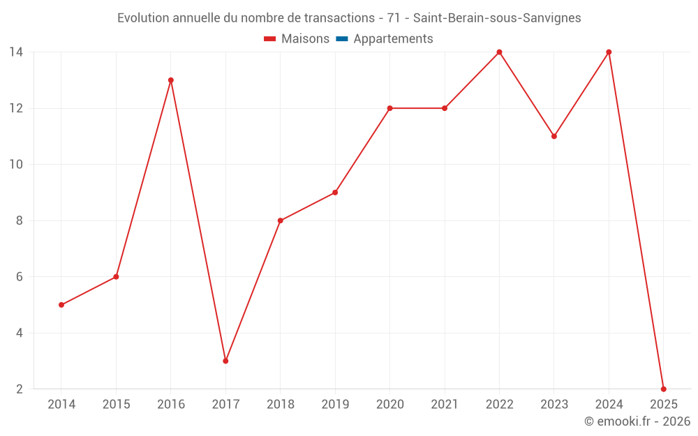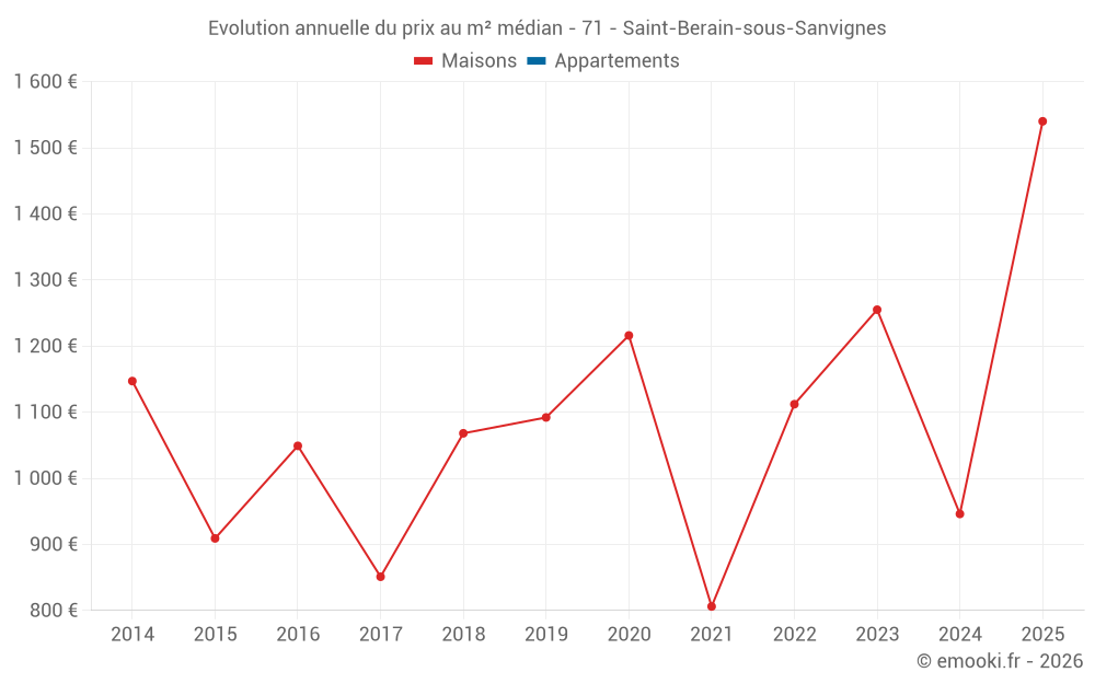 Le prix médian sur les 25 transactions de maisons des 24 derniers mois dans la commune de Saint-Berain-sous-Sanvignes était de 1 314 € par mètre carré pour une valeur foncière médiane de 110 000 €. Sur cette période 60% des transactions se sont situées entre 787 et 1 738 € par mètre carré (du 2ème au 8ème déciles).