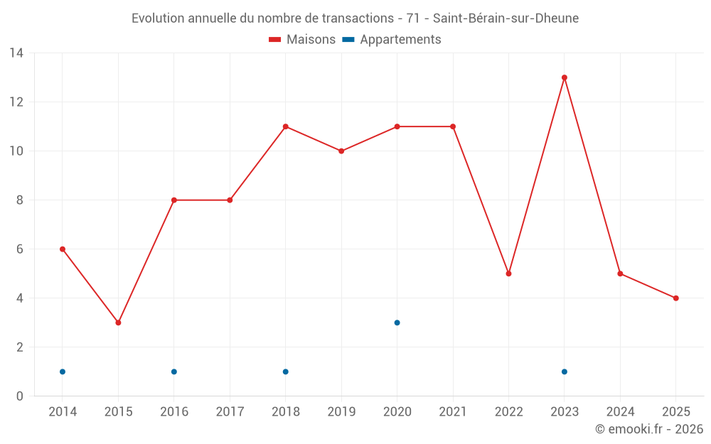 Le prix médian sur les 15 transactions de maisons des 24 derniers mois dans la commune de Saint-Bérain-sur-Dheune était de 902 € par mètre carré pour une valeur foncière médiane de 60 000 €. Sur cette période 60% des transactions se sont situées entre 423 et 1 582 € par mètre carré (du 2ème au 8ème déciles).