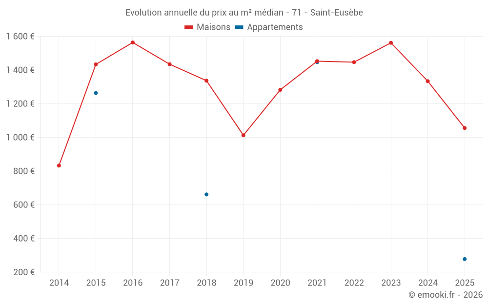 Le prix médian sur les 24 transactions de maisons des 24 derniers mois dans la commune de Saint-Eusèbe était de 1 410 € par mètre carré pour une valeur foncière médiane de 120 000 €. Sur cette période 60% des transactions se sont situées entre 950 et 2 109 € par mètre carré (du 2ème au 8ème déciles).