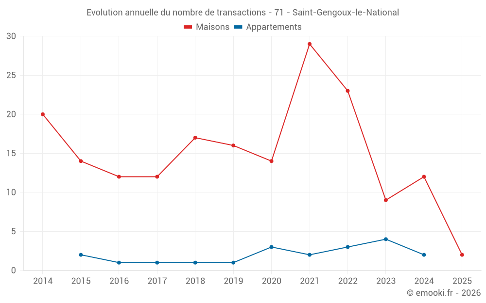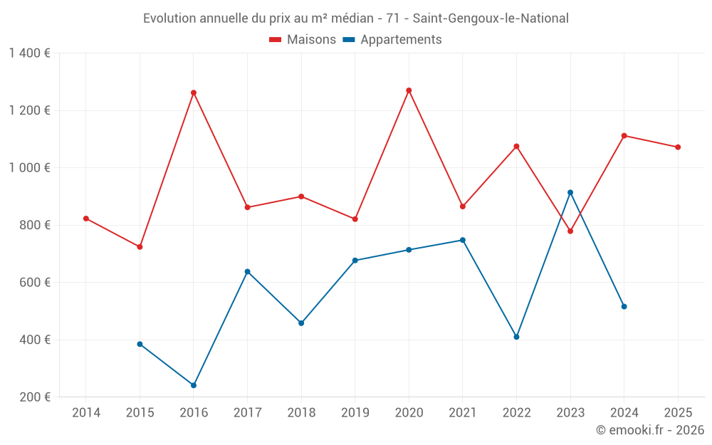 Le prix médian sur les 17 transactions de maisons des 24 derniers mois dans la commune de Saint-Gengoux-le-National était de 1 109 € par mètre carré pour une valeur foncière médiane de 127 000 €. Sur cette période 60% des transactions se sont situées entre 765 et 1 811 € par mètre carré (du 2ème au 8ème déciles).