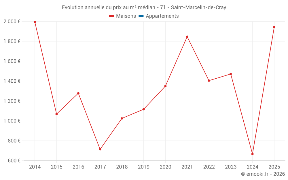 Le prix au m² des maisons a augmenté de 191% depuis 1 an, mais il a diminué de 2.6% en 11 ans.