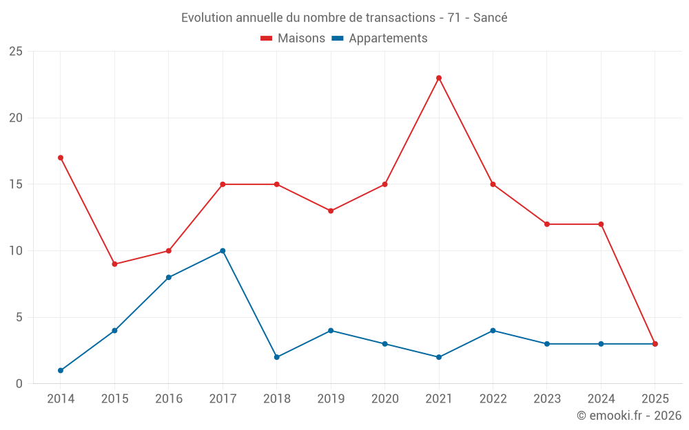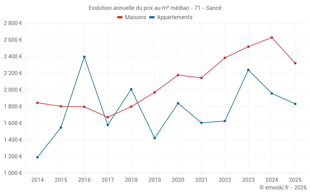 Le prix médian sur les 20 transactions de maisons des 24 derniers mois dans la commune de Sancé était de 2 508 € par mètre carré pour une valeur foncière médiane de 294 335 €. Sur cette période 60% des transactions se sont situées entre 1 695 et 2 745 € par mètre carré (du 2ème au 8ème déciles).