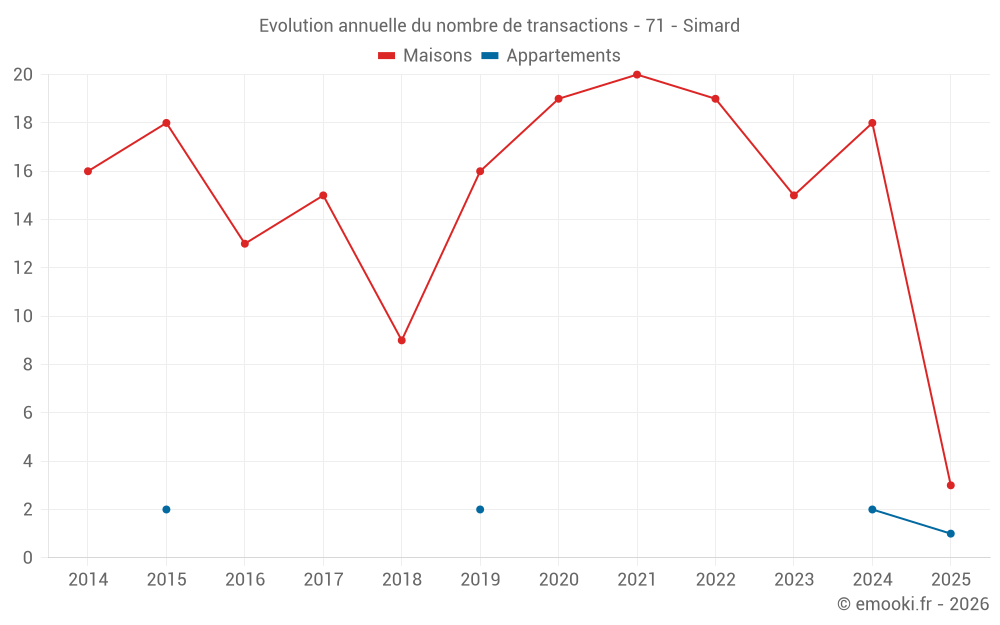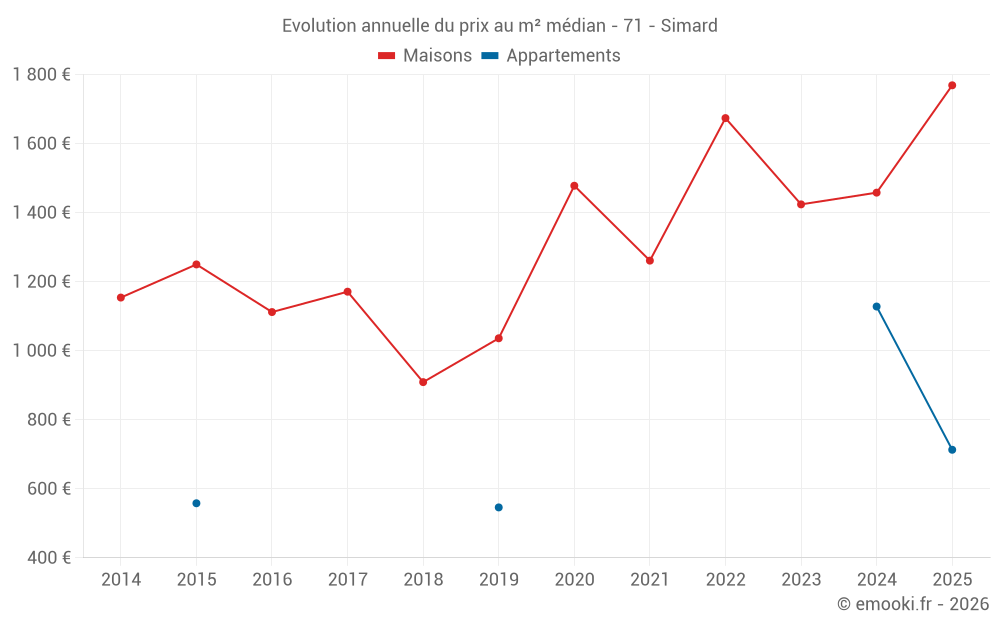 Le prix médian sur les 17 transactions de maisons des 12 derniers mois dans la commune de Simard était de 1 473 € par mètre carré pour une valeur foncière médiane de 147 100 €. Sur cette période 60% des transactions se sont situées entre 1 219 et 2 072 € par mètre carré (du 2ème au 8ème déciles).