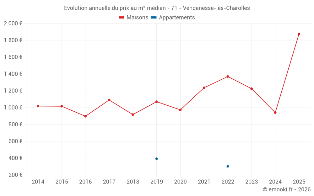 Le prix médian sur les 21 transactions de maisons des 24 derniers mois dans la commune de Vendenesse-lès-Charolles était de 1 225 € par mètre carré pour une valeur foncière médiane de 124 900 €. Sur cette période 60% des transactions se sont situées entre 792 et 1 875 € par mètre carré (du 2ème au 8ème déciles).