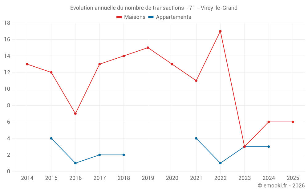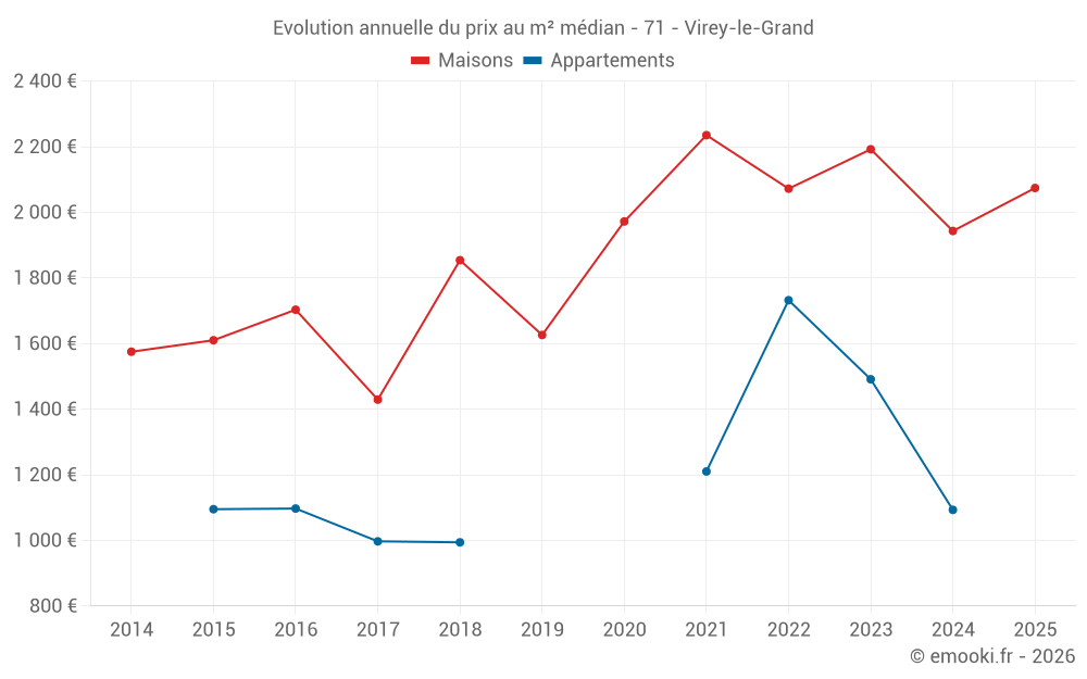 Le prix médian sur les 15 transactions de maisons des 24 derniers mois dans la commune de Virey-le-Grand était de 2 080 € par mètre carré pour une valeur foncière médiane de 235 000 €. Sur cette période 60% des transactions se sont situées entre 1 696 et 2 408 € par mètre carré (du 2ème au 8ème déciles).