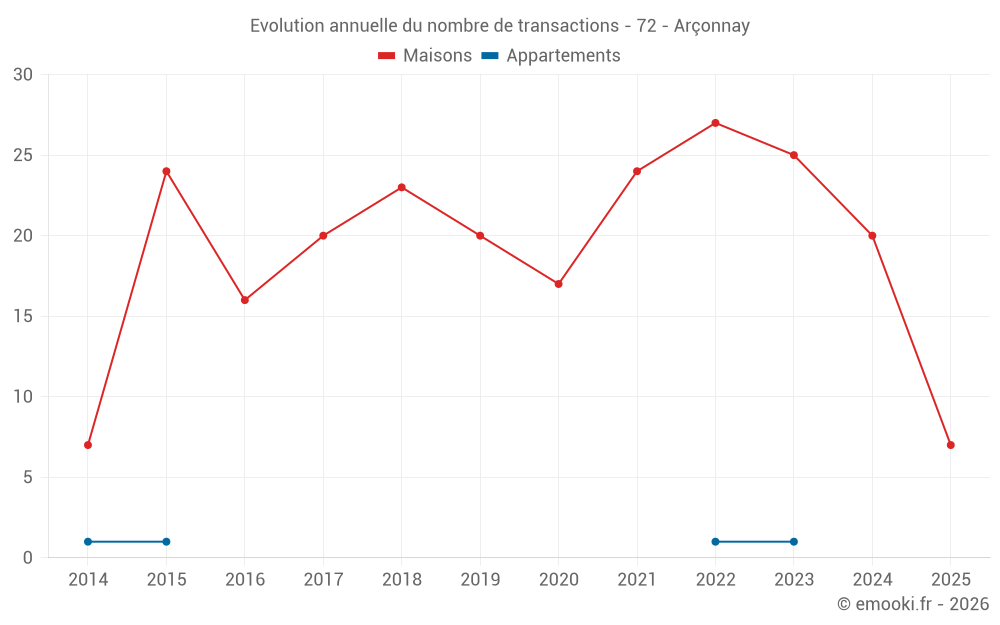 Le prix médian sur les 17 transactions de maisons des 12 derniers mois dans la commune d'Arçonnay était de 1 529 € par mètre carré pour une valeur foncière médiane de 144 000 €. Sur cette période 60% des transactions se sont situées entre 1 288 et 1 860 € par mètre carré (du 2ème au 8ème déciles).