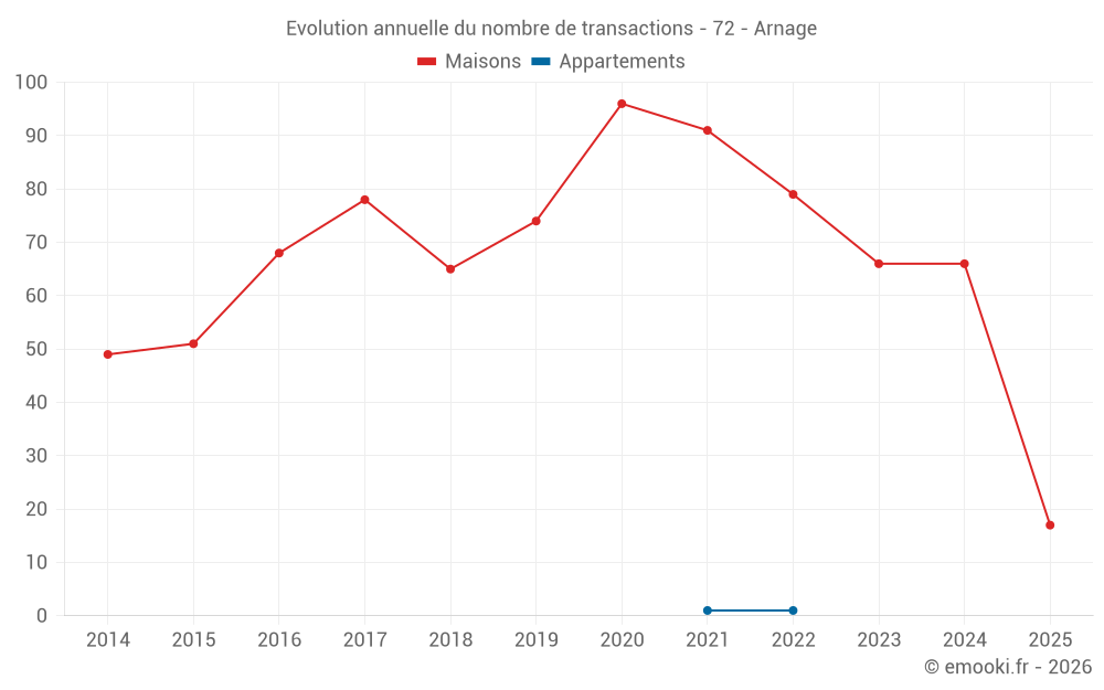 Le prix médian sur les 56 transactions de maisons des 12 derniers mois dans la commune d'Arnage était de 1 824 € par mètre carré pour une valeur foncière médiane de 162 000 €. Sur cette période 60% des transactions se sont situées entre 1 478 et 2 238 € par mètre carré (du 2ème au 8ème déciles).