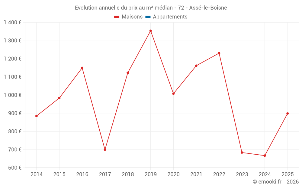 Le prix médian sur les 21 transactions de maisons des 24 derniers mois dans la commune d'Assé-le-Boisne était de 840 € par mètre carré pour une valeur foncière médiane de 80 000 €. Sur cette période 60% des transactions se sont situées entre 510 et 1 399 € par mètre carré (du 2ème au 8ème déciles).