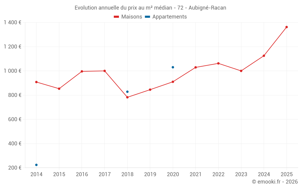 Le prix médian sur les 30 transactions de maisons des 12 derniers mois dans la commune d'Aubigné-Racan était de 1 214 € par mètre carré pour une valeur foncière médiane de 96 500 €. Sur cette période 60% des transactions se sont situées entre 751 et 1 623 € par mètre carré (du 2ème au 8ème déciles).