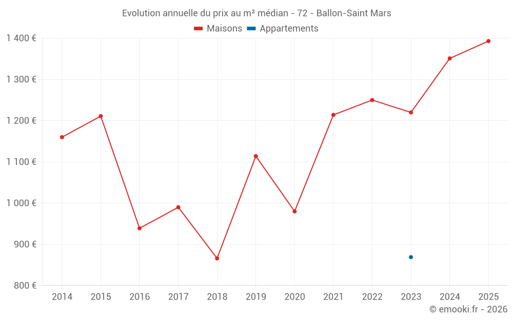 Le prix médian sur les 27 transactions de maisons des 12 derniers mois dans la commune de Ballon-Saint Mars était de 1 187 € par mètre carré pour une valeur foncière médiane de 100 000 €. Sur cette période 60% des transactions se sont situées entre 746 et 1 570 € par mètre carré (du 2ème au 8ème déciles).