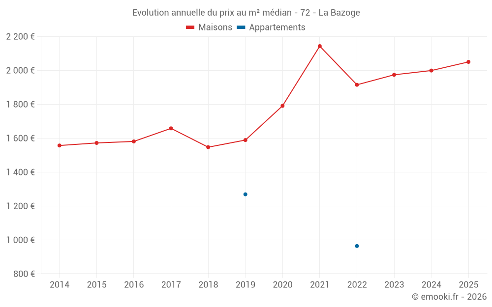 Le prix médian sur les 41 transactions de maisons des 12 derniers mois dans la commune de la Bazoge était de 2 010 € par mètre carré pour une valeur foncière médiane de 196 000 €. Sur cette période 60% des transactions se sont situées entre 1 265 et 2 544 € par mètre carré (du 2ème au 8ème déciles).
