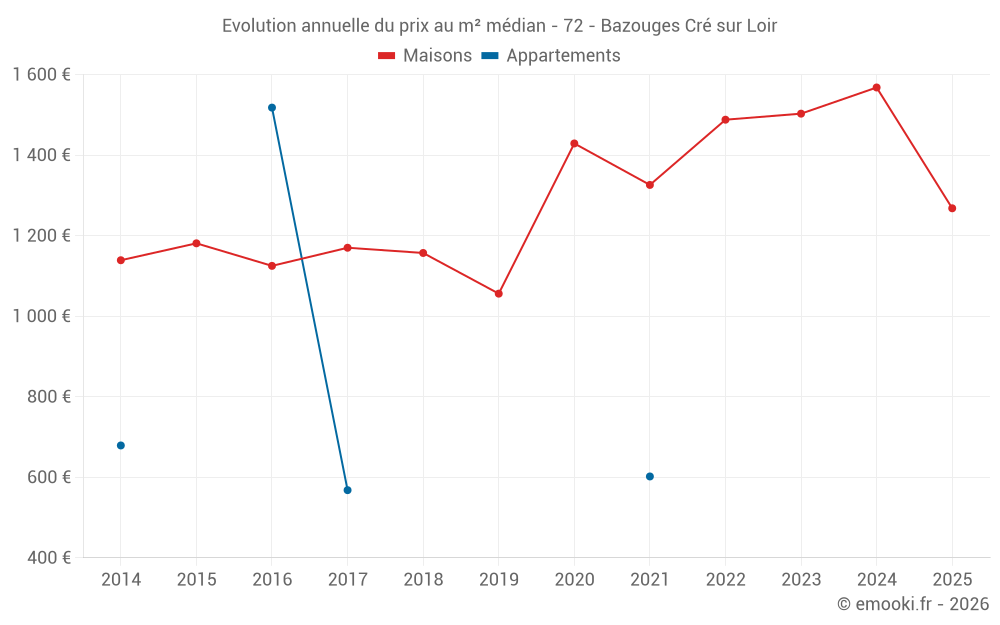 Le prix médian sur les 22 transactions de maisons des 12 derniers mois dans la commune de Bazouges Cré sur Loir était de 1 529 € par mètre carré pour une valeur foncière médiane de 155 000 €. Sur cette période 60% des transactions se sont situées entre 971 et 1 925 € par mètre carré (du 2ème au 8ème déciles).