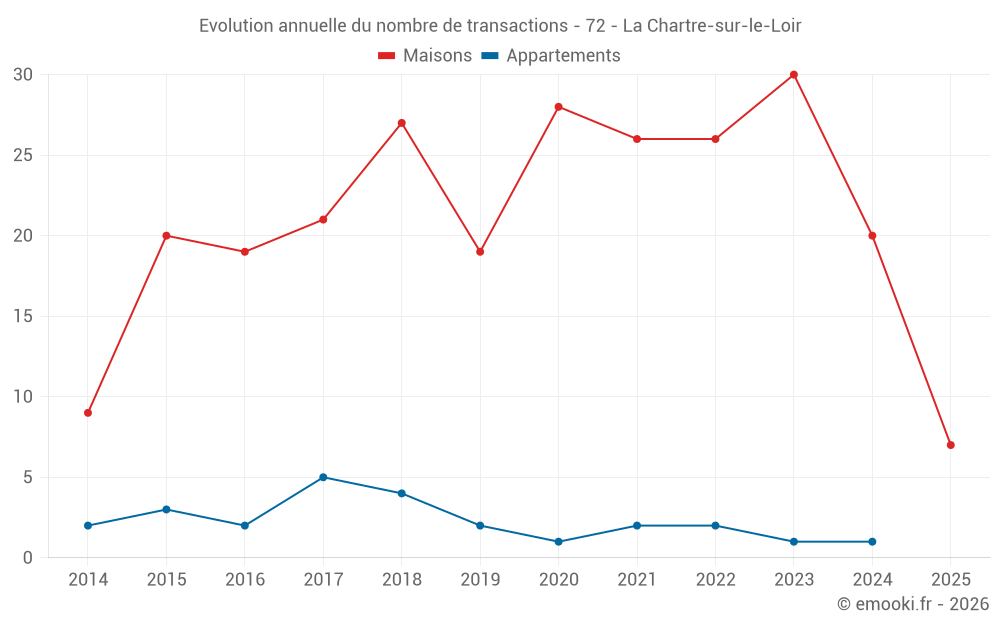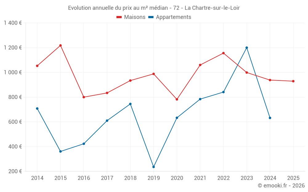 Le prix médian sur les 18 transactions de maisons des 12 derniers mois dans la commune de la Chartre-sur-le-Loir était de 1 006 € par mètre carré pour une valeur foncière médiane de 94 000 €. Sur cette période 60% des transactions se sont situées entre 652 et 1 401 € par mètre carré (du 2ème au 8ème déciles).