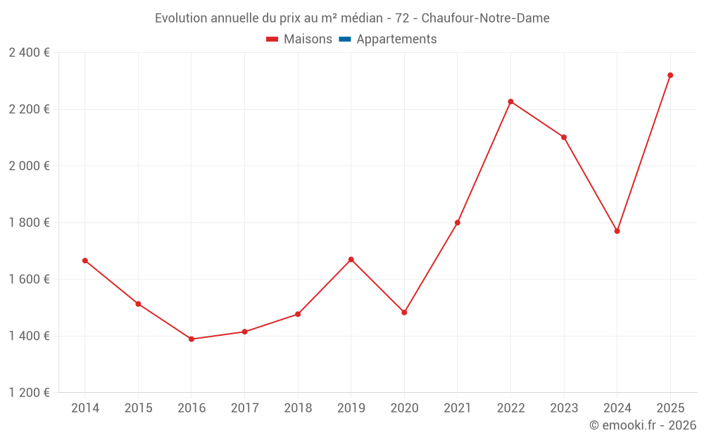 Le prix médian sur les 18 transactions de maisons des 24 derniers mois dans la commune de Chaufour-Notre-Dame était de 1 866 € par mètre carré pour une valeur foncière médiane de 178 625 €. Sur cette période 60% des transactions se sont situées entre 1 426 et 2 242 € par mètre carré (du 2ème au 8ème déciles).