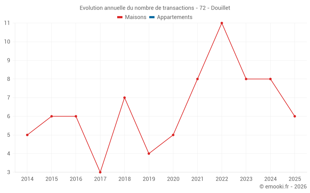 Le prix médian sur les 17 transactions de maisons des 24 derniers mois dans la commune de Douillet était de 754 € par mètre carré pour une valeur foncière médiane de 60 500 €. Sur cette période 60% des transactions se sont situées entre 449 et 1 308 € par mètre carré (du 2ème au 8ème déciles).