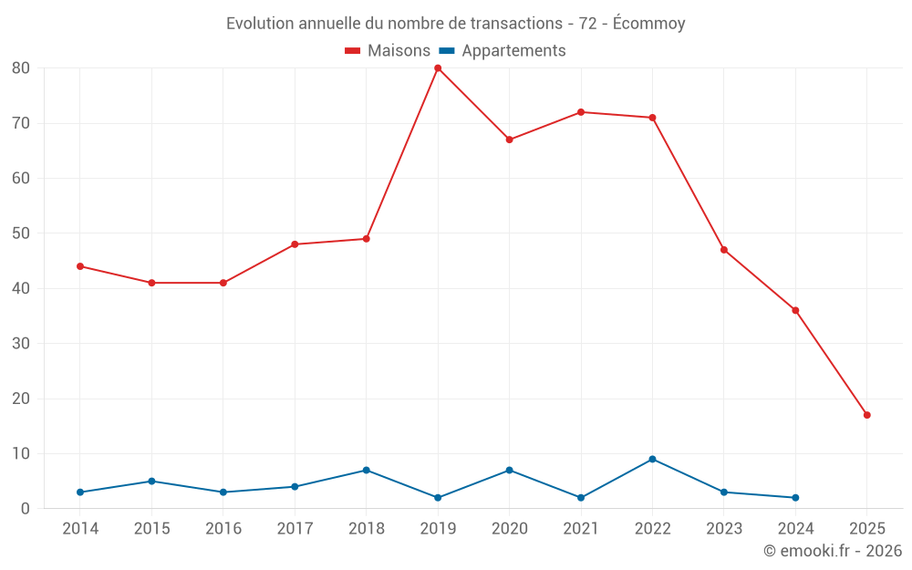 Le prix médian sur les 39 transactions de maisons des 12 derniers mois dans la commune d'Écommoy était de 1 561 € par mètre carré pour une valeur foncière médiane de 175 000 €. Sur cette période 60% des transactions se sont situées entre 1 051 et 2 074 € par mètre carré (du 2ème au 8ème déciles).