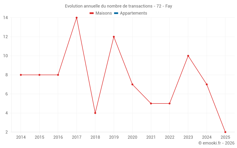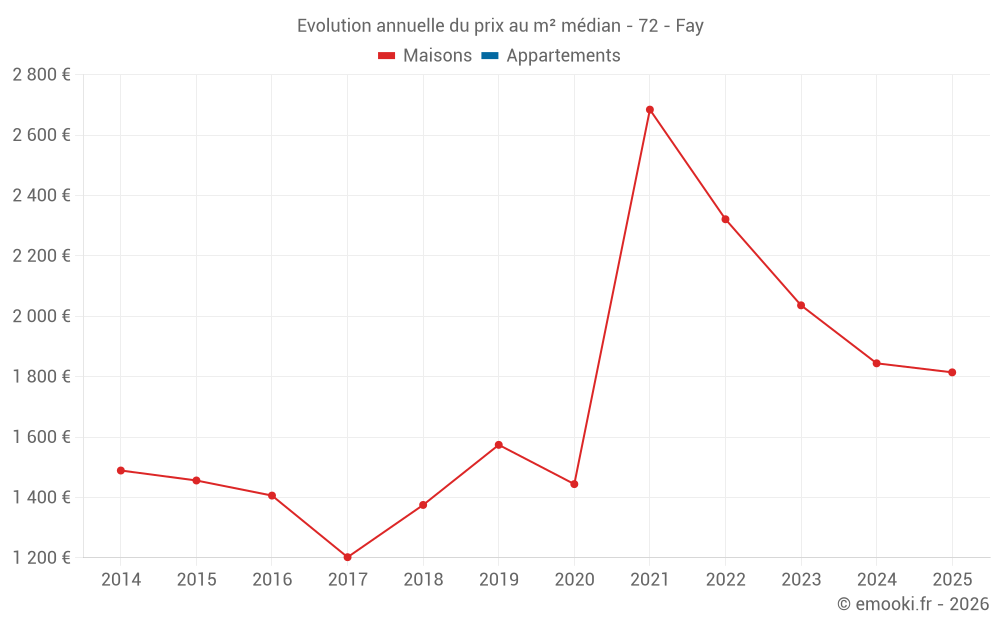 Le prix médian sur les 15 transactions de maisons des 24 derniers mois dans la commune de Fay était de 1 814 € par mètre carré pour une valeur foncière médiane de 223 000 €. Sur cette période 60% des transactions se sont situées entre 1 336 et 2 466 € par mètre carré (du 2ème au 8ème déciles).