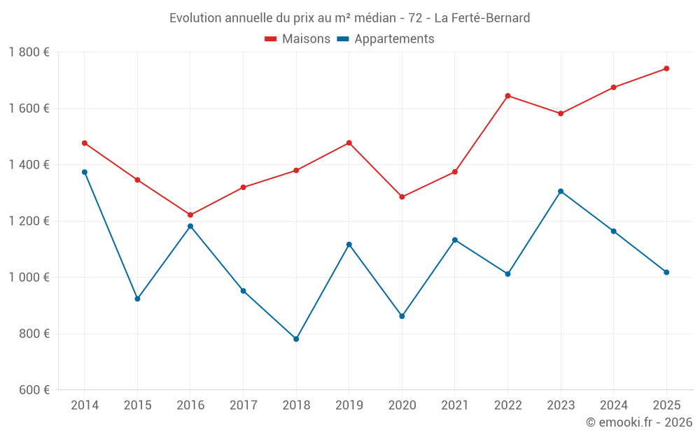 Le prix médian sur les 28 transactions d'appartements des 12 derniers mois dans la commune de la Ferté-Bernard était de 1 038 € par mètre carré pour une valeur foncière médiane de 55 250 €. Sur cette période 60% des transactions se sont situées entre 821 et 1 770 € par mètre carré (du 2ème au 8ème déciles).