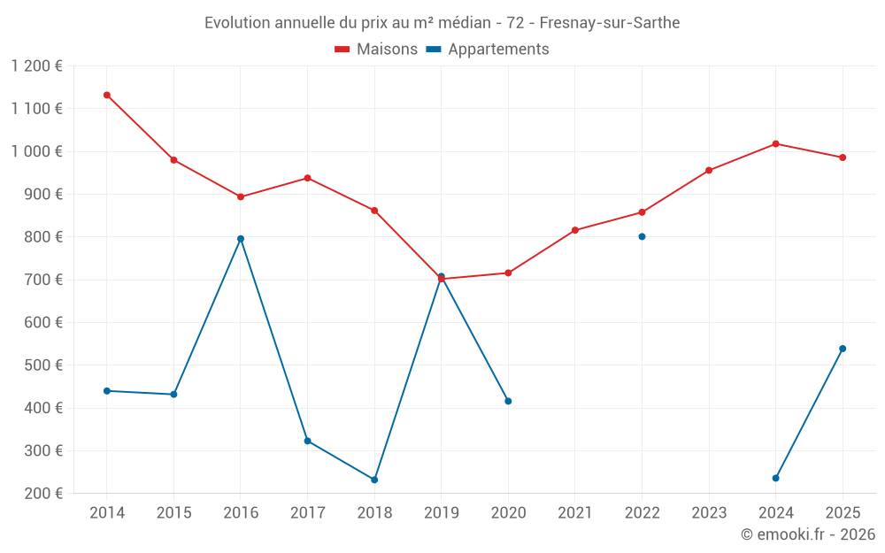 Le prix médian sur les 32 transactions de maisons des 12 derniers mois dans la commune de Fresnay-sur-Sarthe était de 997 € par mètre carré pour une valeur foncière médiane de 86 500 €. Sur cette période 60% des transactions se sont situées entre 585 et 1 418 € par mètre carré (du 2ème au 8ème déciles).