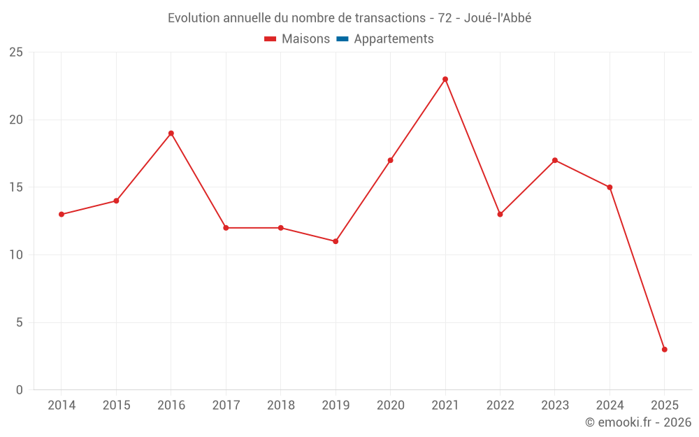 Le prix médian sur les 30 transactions de maisons des 24 derniers mois dans la commune de Joué-l'Abbé était de 1 772 € par mètre carré pour une valeur foncière médiane de 175 750 €. Sur cette période 60% des transactions se sont situées entre 1 218 et 2 063 € par mètre carré (du 2ème au 8ème déciles).