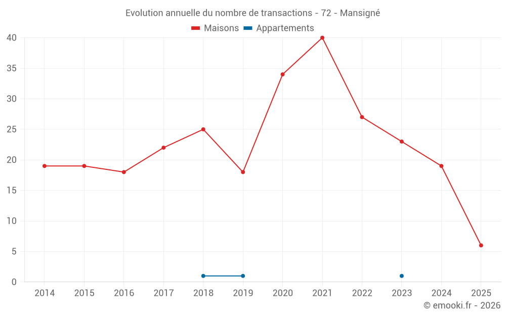 Le prix médian sur les 22 transactions de maisons des 12 derniers mois dans la commune de Mansigné était de 1 325 € par mètre carré pour une valeur foncière médiane de 138 750 €. Sur cette période 60% des transactions se sont situées entre 636 et 1 763 € par mètre carré (du 2ème au 8ème déciles).