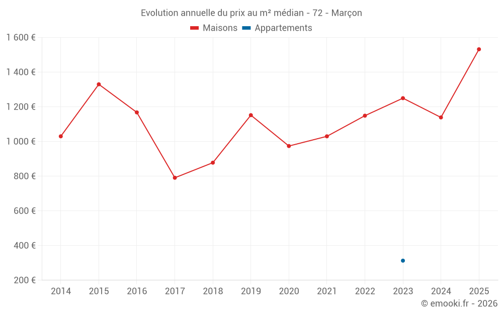 Le prix médian sur les 29 transactions de maisons des 24 derniers mois dans la commune de Marçon était de 1 167 € par mètre carré pour une valeur foncière médiane de 98 500 €. Sur cette période 60% des transactions se sont situées entre 821 et 1 733 € par mètre carré (du 2ème au 8ème déciles).