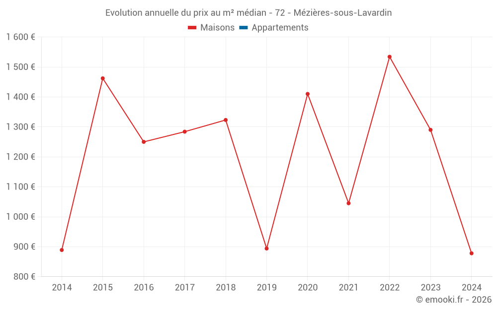 Le prix médian sur les 14 transactions de maisons des 24 derniers mois dans la commune de Mézières-sous-Lavardin était de 968 € par mètre carré pour une valeur foncière médiane de 107 500 €. Sur cette période 60% des transactions se sont situées entre 746 et 1 335 € par mètre carré (du 2ème au 8ème déciles).