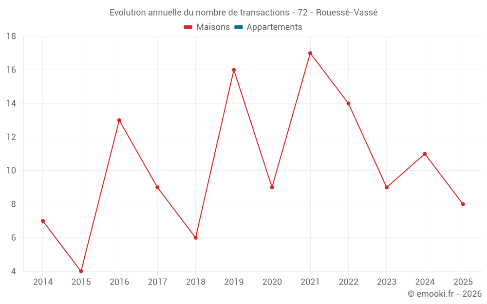 Le prix médian sur les 25 transactions de maisons des 24 derniers mois dans la commune de Rouessé-Vassé était de 927 € par mètre carré pour une valeur foncière médiane de 85 000 €. Sur cette période 60% des transactions se sont situées entre 371 et 1 437 € par mètre carré (du 2ème au 8ème déciles).