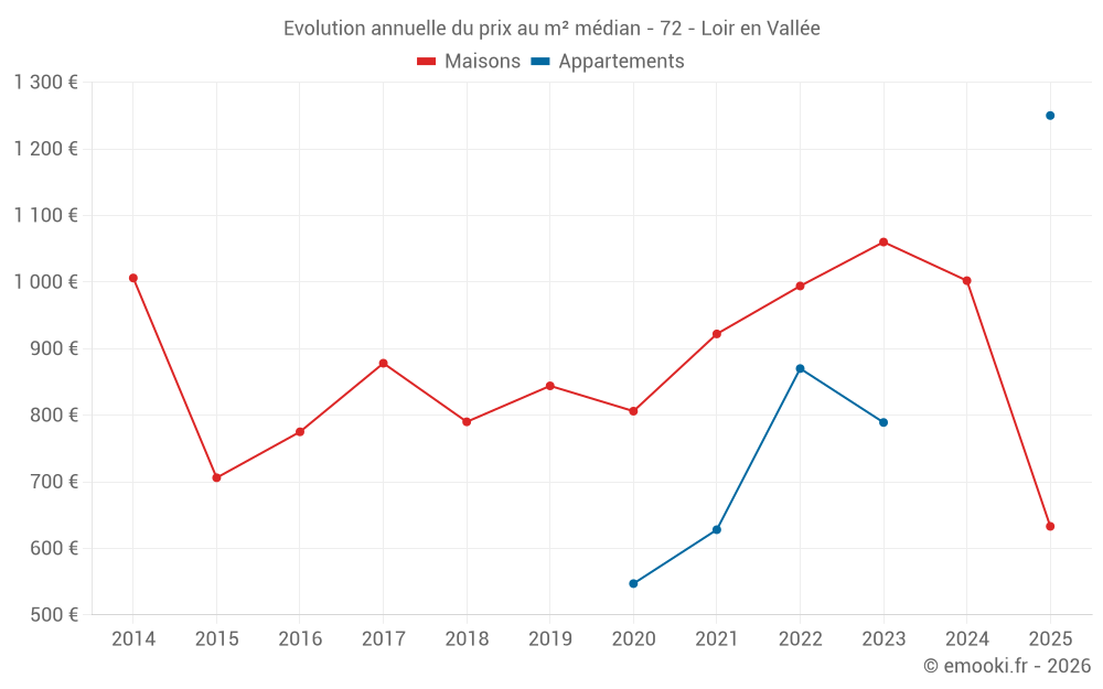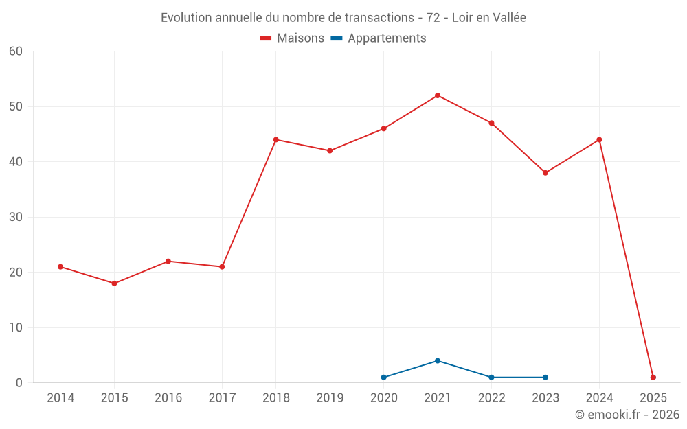 Le prix médian sur les 20 transactions de maisons des 12 derniers mois dans la commune de Loir en Vallée était de 905 € par mètre carré pour une valeur foncière médiane de 74 500 €. Sur cette période 60% des transactions se sont situées entre 629 et 1 375 € par mètre carré (du 2ème au 8ème déciles).