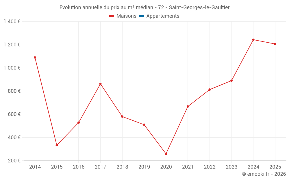 Le prix médian sur les 19 transactions de maisons des 24 derniers mois dans la commune de Saint-Georges-le-Gaultier était de 1 067 € par mètre carré pour une valeur foncière médiane de 60 000 €. Sur cette période 60% des transactions se sont situées entre 457 et 1 327 € par mètre carré (du 2ème au 8ème déciles).