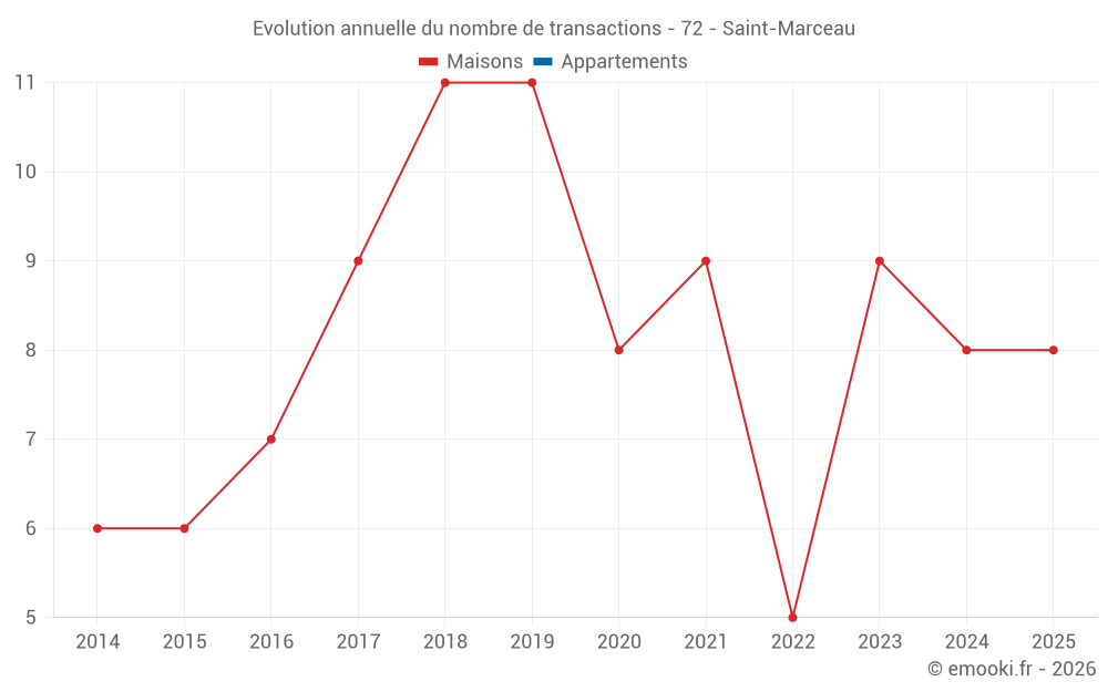 Le prix médian sur les 16 transactions de maisons des 24 derniers mois dans la commune de Saint-Marceau était de 1 350 € par mètre carré pour une valeur foncière médiane de 87 550 €. Sur cette période 60% des transactions se sont situées entre 750 et 1 739 € par mètre carré (du 2ème au 8ème déciles).