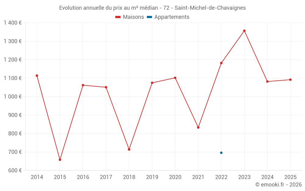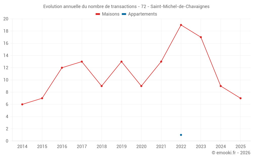 Le prix médian sur les 27 transactions de maisons des 24 derniers mois dans la commune de Saint-Michel-de-Chavaignes était de 1 145 € par mètre carré pour une valeur foncière médiane de 90 500 €. Sur cette période 60% des transactions se sont situées entre 903 et 1 799 € par mètre carré (du 2ème au 8ème déciles).
